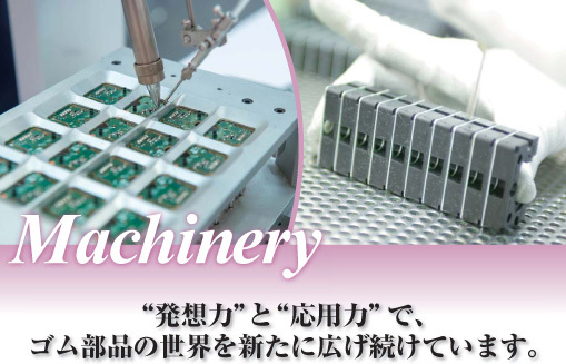 農業機械や建設機械や、芝刈り機・モーターボートなどの汎用エンジン、発電機などに搭載される各種ゴム部品を開発・生産しています。機械関連で求められるのは、なにより“発想力”と“応用力”。お客様からの仕様や図面に従うだけではなく、その機械がどういうところで、どのように使われるのかをよく考え、お客様の仕様や図面に込められた真のニーズを把握する発想力。真のニーズに、既存の技術を組み合わせて効率的かつ迅速にお応えする応用力。